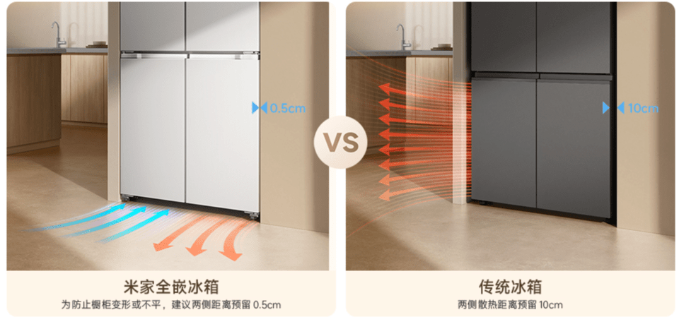 冰箱嵌入到有限空间的橱柜中,散热设计也与传统冰箱有着本质上的区别。传统冰箱使用左右两侧散热,需要冰箱两侧距离安装的柜体或者墙体约10cm的距离,用于热空气的排出。纤薄嵌 | 米家冰箱 十字521L 超薄全嵌采用了专门为嵌入使用情况下空间局限场景设计的底部散热布局,让冰箱可以距离两侧墙面更近,左右两边仅需要各预留5mm用于安装调整即可。