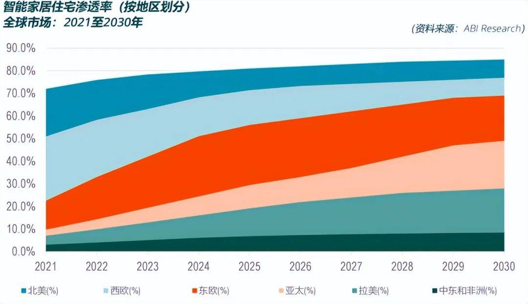 而在Matter协议的强力推动下,亚太、欧洲和拉美等地区的智能家居渗透率将得到快速提升,如下图所示。