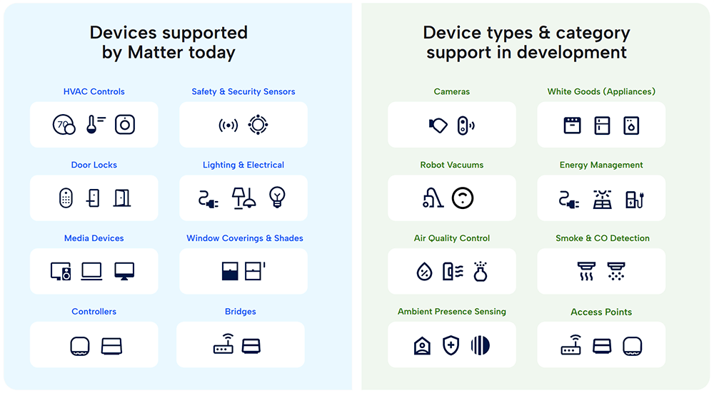 在Matter支持的产品类型方面,首批支持的设备类型有:照明电气(灯泡,插座,开关),暖通控制,窗帘幕帘,门锁,媒体播放设备,安全安防和传感器(门磁,报警器),网桥设备(网关)和控制设备(手机、智能音箱,中控面板等集成了控制APP的设备)。
