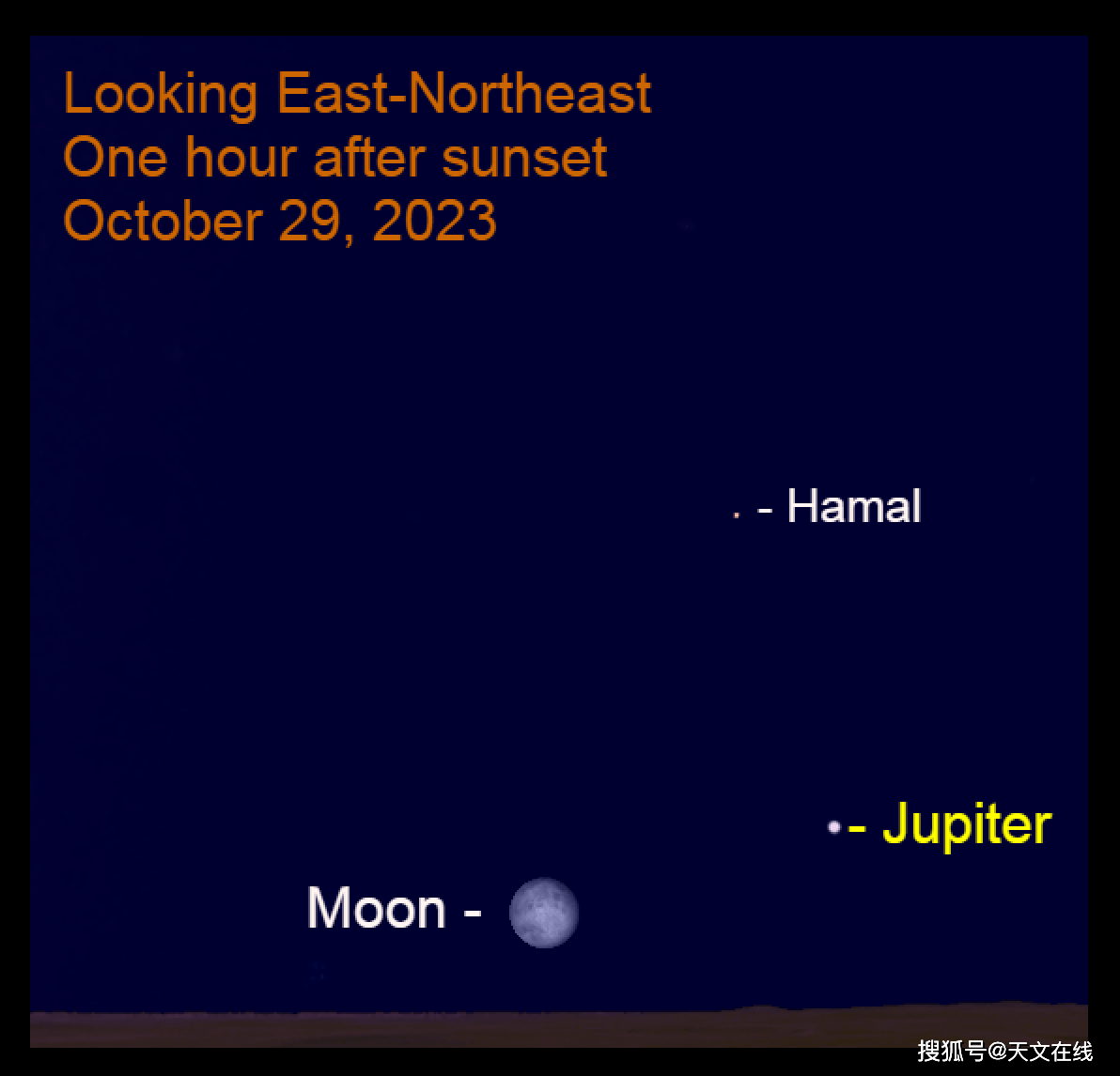 2023年10月29日,图表标题:太阳落山一个小时后,木星和月亮出现在东方天空。