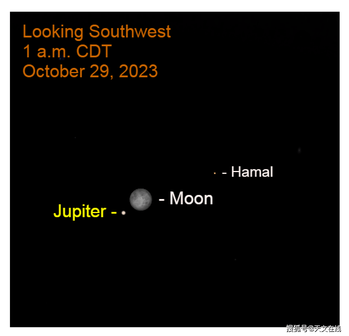 图表说明—2023年10月29日:在清晨的时候,木星和月球彼此相距很近。