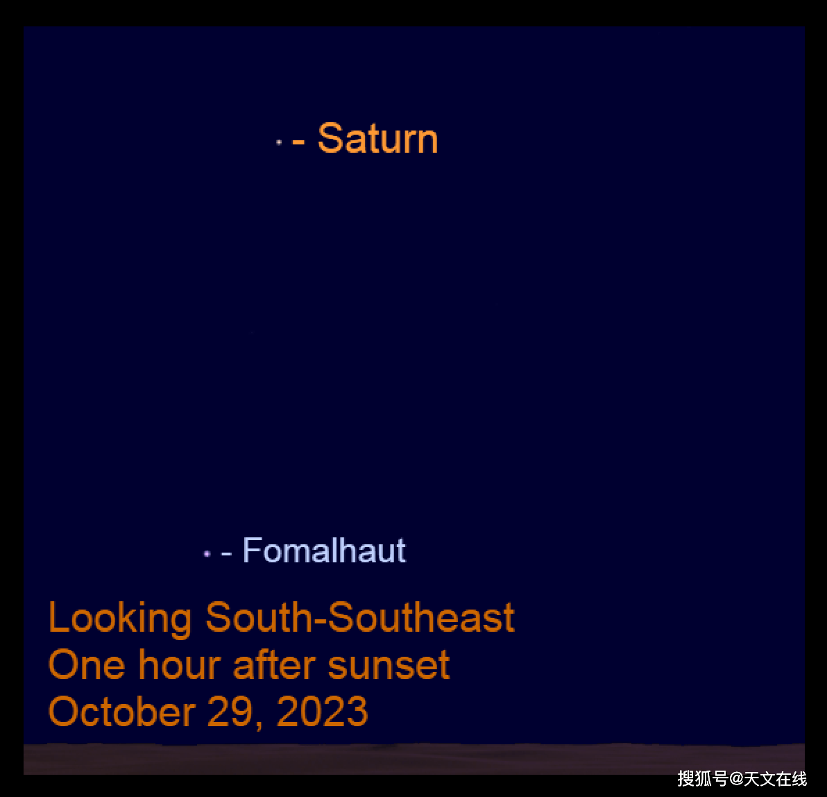 2023年10月29日,图表标题:太阳落山一个小时以后,土星和北落师门恒星出现在东南偏南上空。