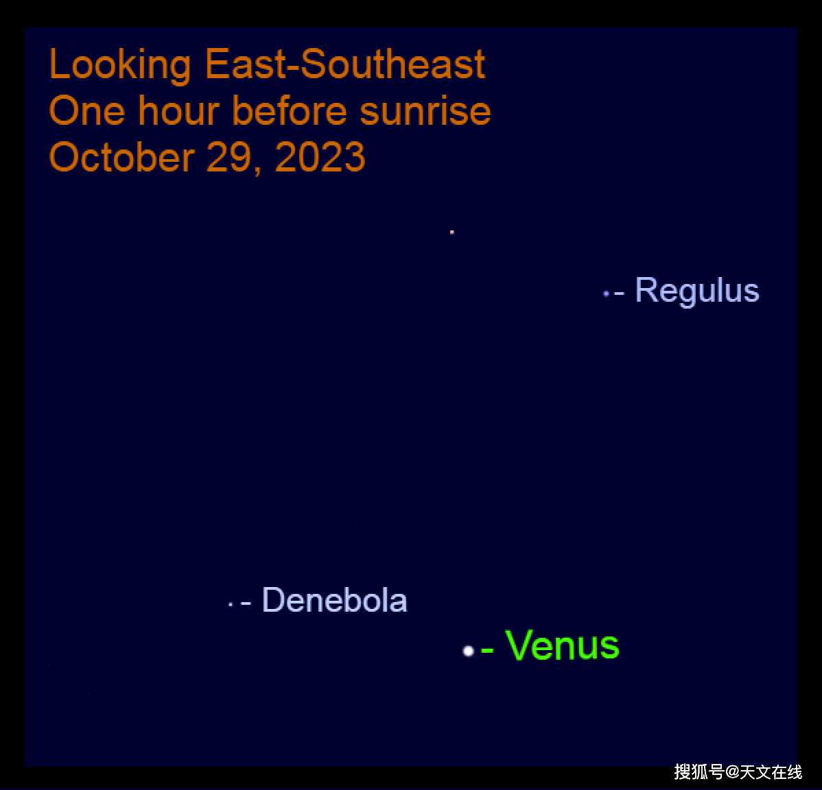11月1日,金星与五帝座一Denebola以较宽的角距相合,随后经过它,于两个早晨后进入处女座。