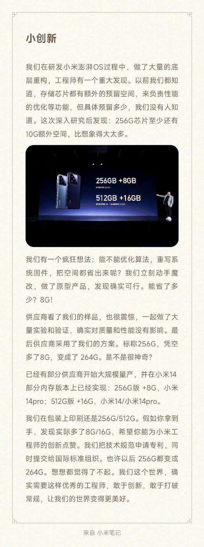 鞭牛士 10月27日消息,昨日晚间小米CEO雷军发文称,在研发小米澎湃OS过程中,做了大量的底层重构,深入研究后发现,256G芯片至少还有10G额外空间,比想象得大太多。立刻动手魔改,做了原型产品,发现确实可行,256G凭空多了8G变成了 264G。