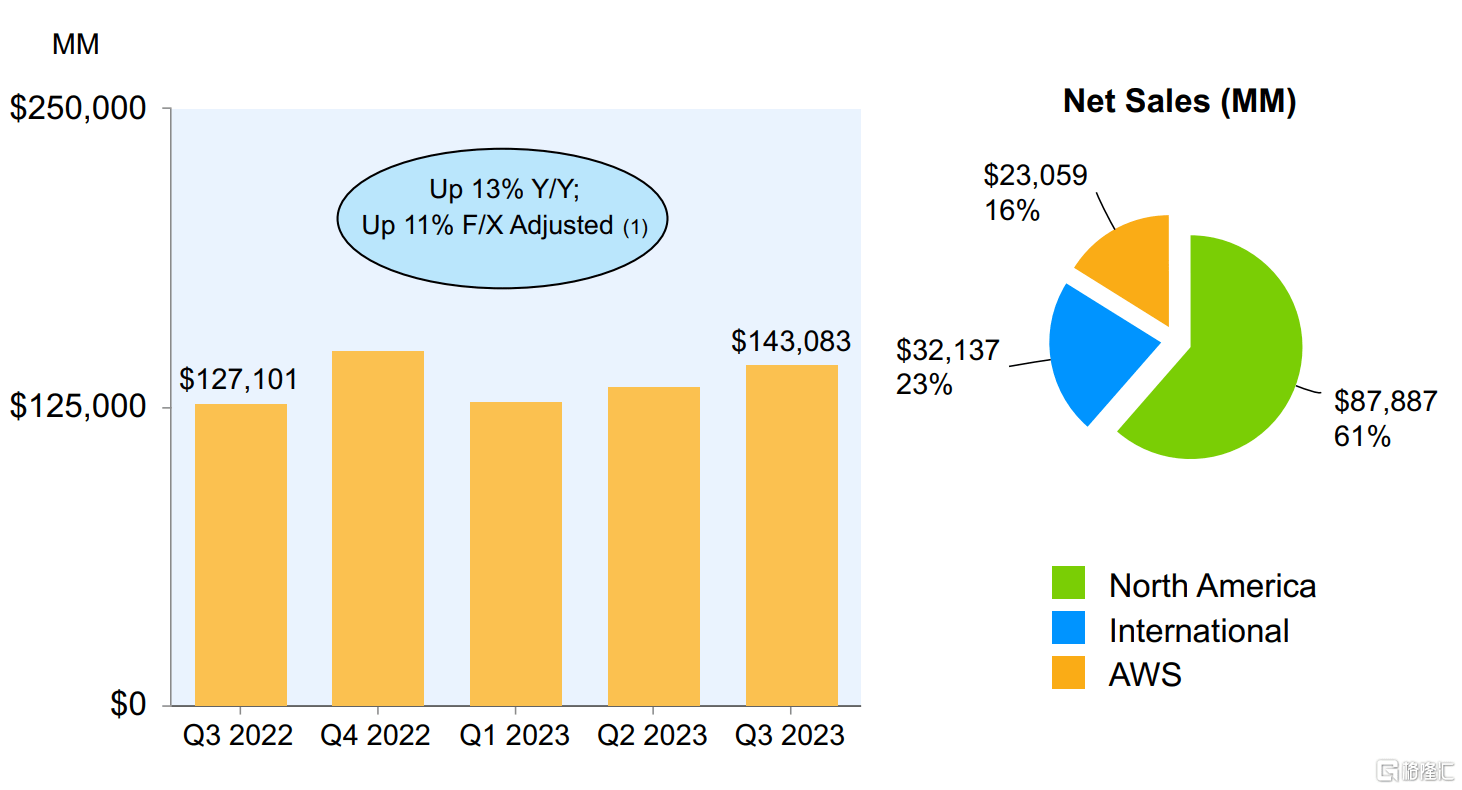 具体来看,亚马逊三季度收入1430.83亿美元,同比增长13%,环比增6.5%,分析师预期为1414亿美元;
