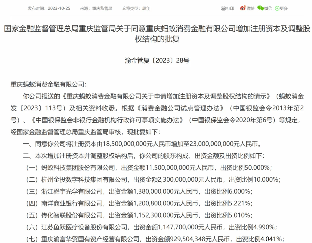 国家金融监督管理总局官网10月25日批复信息显示,经国家金融监督管理总局重庆监管局审核批复,同意蚂蚁消金将注册资本由185亿元人民币增加至230亿元人民币。同时,蚂蚁消金的股东数量增加至13家。