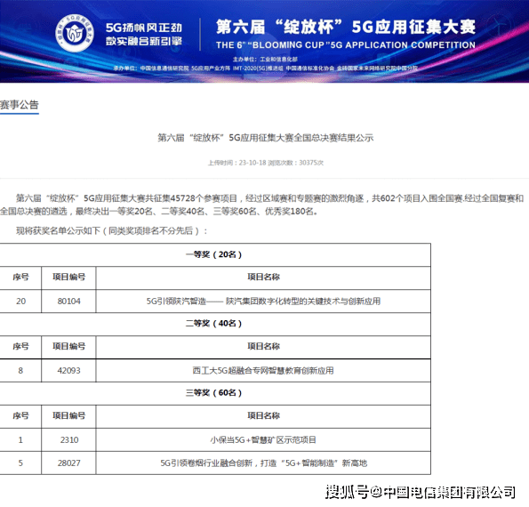 经过3个月的激烈角逐,10月17日,第六届“绽放杯”5G应用征集大赛总决赛落下帷幕,中国电信陕西公司获得一等奖1个,二等奖1个,三等奖2个,获奖总数和等级创历史新高。