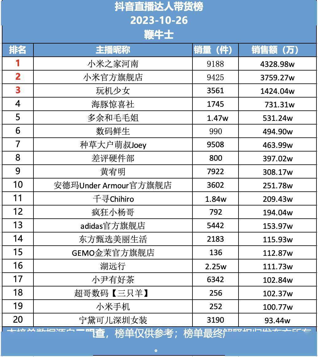 10月26日,抖音带货榜一是小米之家河南,销售额4328.98万元,榜二小米官方旗舰机,销售额3759.27元,榜三玩机少女,销售额1424.04万元。