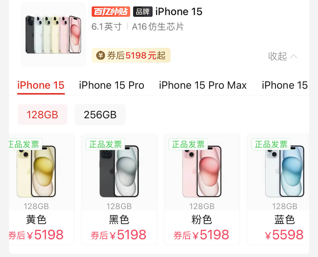 此外,不同存储版本和配色的iPhone 15系列机型,补贴后价格都不一样。在拼多多平台上,同样是iPhone 15 128GB标准版,绿色版补贴后价格为5598元,比苹果官方售价要低400元,但要比同平台其他配色版本高400元。