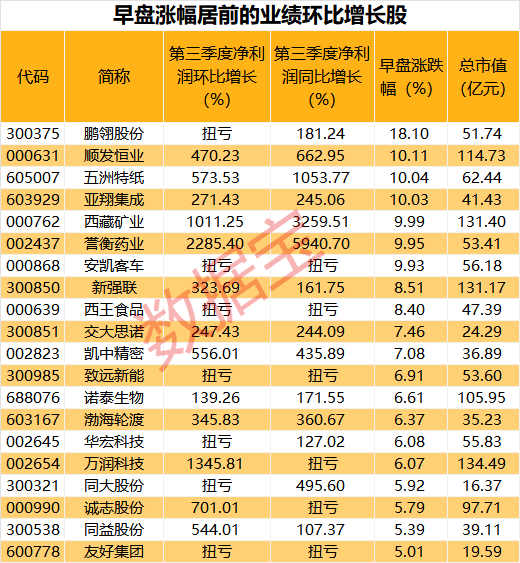 行情上来看,早盘净利润环比增长股普遍跑赢大盘,平均上涨2%,鹏翎股份涨幅达到18.1%,顺发恒业、五洲特纸、亚翔集成、西藏矿业、誉衡药业、安凯客车实现涨停。