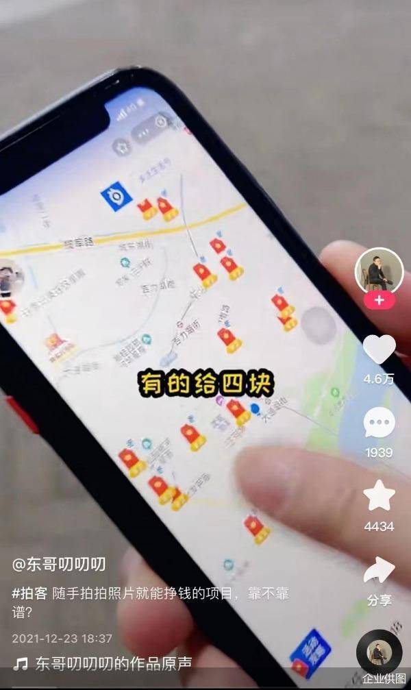 “天津一个大哥拍这个,一天能挣七八百”,东哥在置顶的一条短视频开头,快速抓住了粉丝的眼球。这条视频的灵感,来自于他朋友的朋友提供的信息,“我确认了这个项目确实能挣钱,才决定拍这个内容”,根据他的讲解,只要用手机拍摄路边店铺等平台标注的地点,通过审核后,就可以拿到相应的报酬。截止目前,这条视频有4.6万人点赞,收获了1939条评论,4432个收藏。