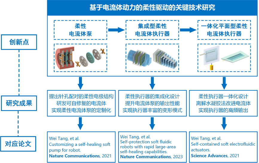 本论文是唐威博士研究课题的重要组成部分,其研究目标是开发基于电流体动力的柔性驱动技术。该技术可以通过电场直接驱动流体,具有静音、无可动部件等优点,是软体机器人驱动的重要实现手段之一。然而,柔性流体驱动系统存在易损坏、易泄漏等严重问题,阻碍了软体机器人的推广与应用。为了解决这些问题,研究团队设计了一种具有自我保护能力的电流体驱动软体机器人。