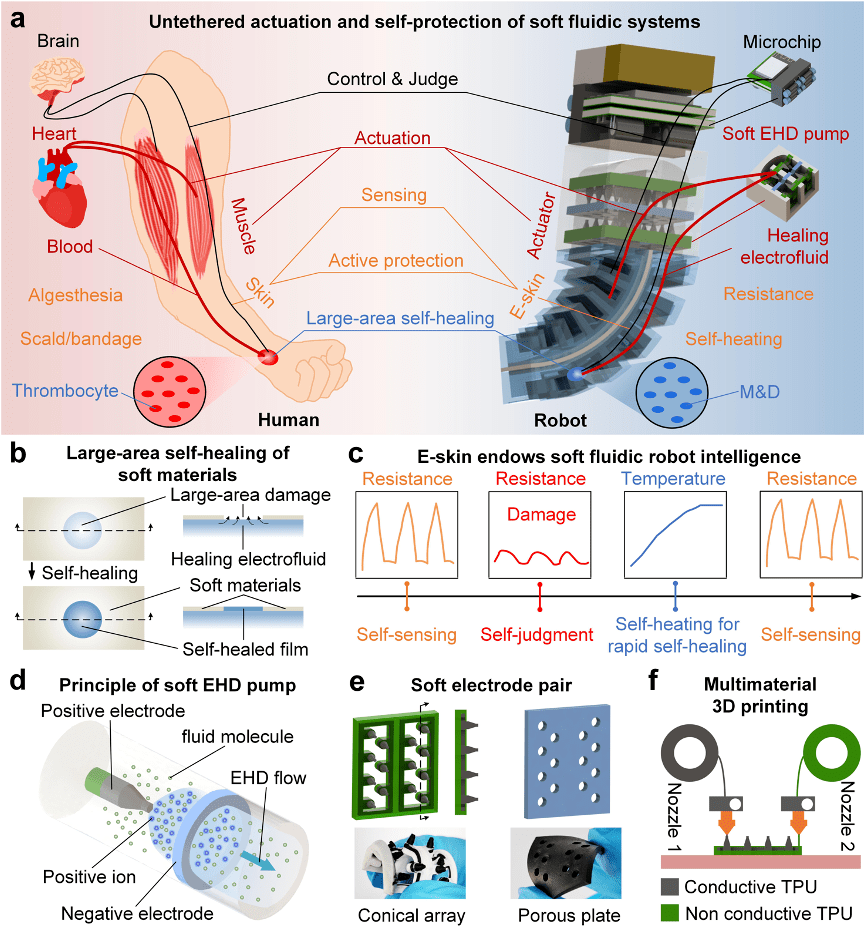 该机器人的工作原理是,当机器人感知到自身受到损伤时,会采取保护措施,通过快速修复实现自我保护。研究团队开发了一种柔性电流体泵,它可以通过电场驱动自修复液体,为机器人提供动力。当机器人受到损伤时,电子皮肤层可以检测到电阻的异常变化,从而意识到自身受到损坏;然后通过电子皮肤层的加热来加速愈合过程,实现机器人的自我修复。