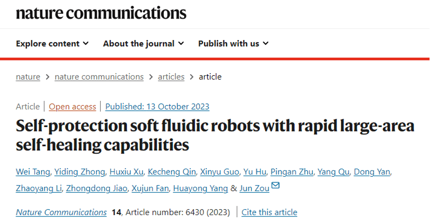 浙江大学机械工程学院的邹俊课题组在软体机器人领域取得了重要进展,他们研制出一种新型的电流体驱动系统,具有快速、大面积自修复和自我保护功能。该系统主要由柔性电流体泵、执行器、自修复液体和多功能电子皮肤层组成。这项成果被国际知名学术期刊Nature Communications报道,全部作者均来自杨华勇院士团队,唐威博士为论文第一作者,邹俊教授为论文通讯作者。这种新型的电流体驱动系统可以解决现有柔性泵存在的问题,如输出性能差、易损坏和易泄漏等,有望促进软体机器人的推广和应用。