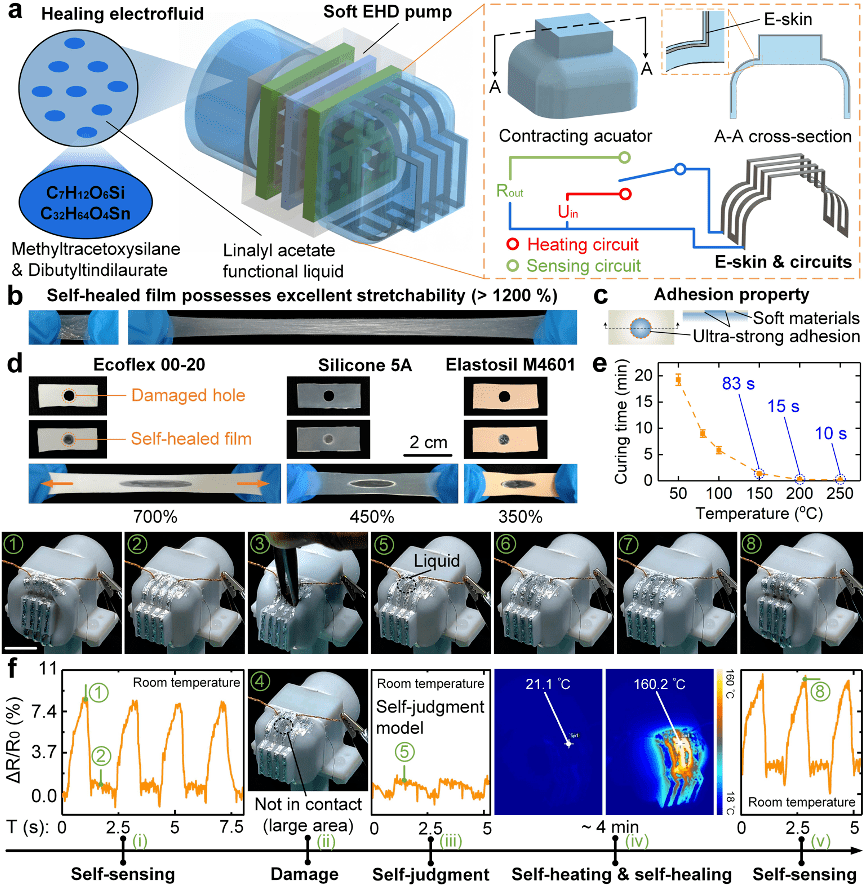 同时,为了解决软材料大面积自修复的挑战,研究团队制备了一种自修复液体。这种液体由电流体、甲基三乙酰氧基硅烷(methyltracetoxysilane)和二丁基二月桂酸锡(dibutyltindilaurate)合成。当这种液体暴露于空气时,它可以固化成粘接性强、可拉伸性优异的柔性膜。测试结果表明:自修复液体可以填补大面积破损,实现硅橡胶的修复。即使修复后的硅橡胶拉伸率达到700%,自修复柔性膜仍能牢固地粘接在破损处。这种方法能实现大面积的破损自修复,这是固体自修复方法目前所无法达到的。