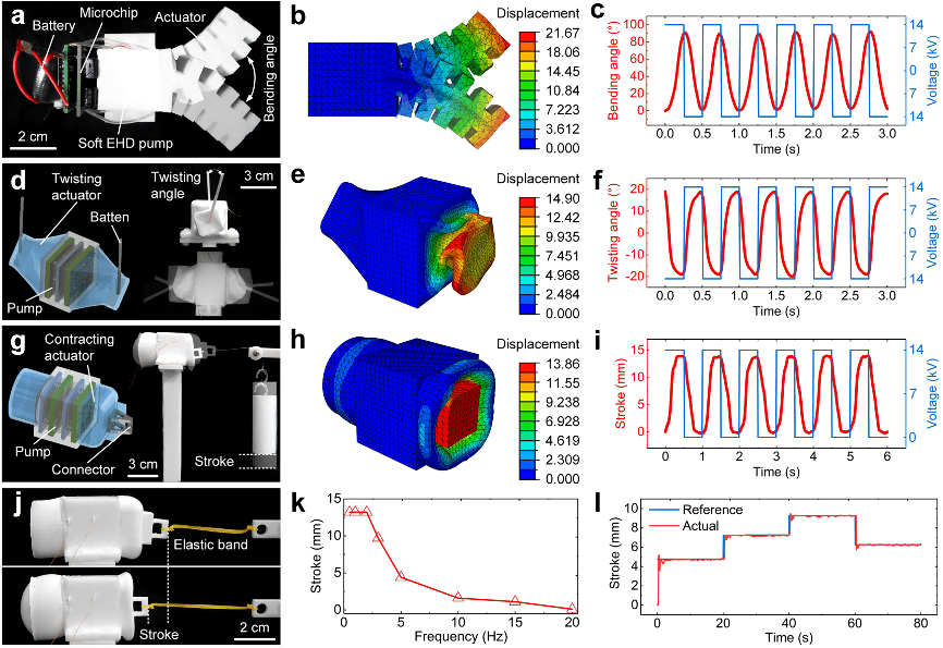 图2. 各种运动形式的电流体驱动软体机器人的变形、频率测试及PID控制