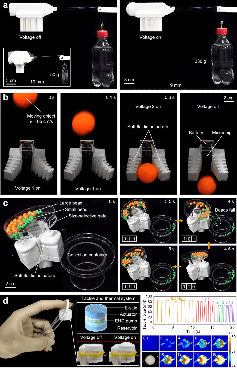 通过添加电极或执行器,可以增强机器人的功能,使其能够承受更大的负载。在50克的负载下,机器人可以移动的最大距离为10毫米。而添加更多的电极之后,机器人可以承受高达330克的负载。此外,还设计了一个电流体驱动集成型抓手,可以抓住快速下落的乒乓球,表明该系统的响应速度非常快。此外,机械筛子还可以实现大小珠子的快速筛选,证明了执行器具有出色的单独/序列控制特性。最后,通过结合电子皮肤层的加热和电流体的驱动功能,研究团队开发了一种可穿戴触感、温感装置,可以为指端提供触觉和温感。这表明了电流体驱动系统在可穿戴设备中的应用潜力。
