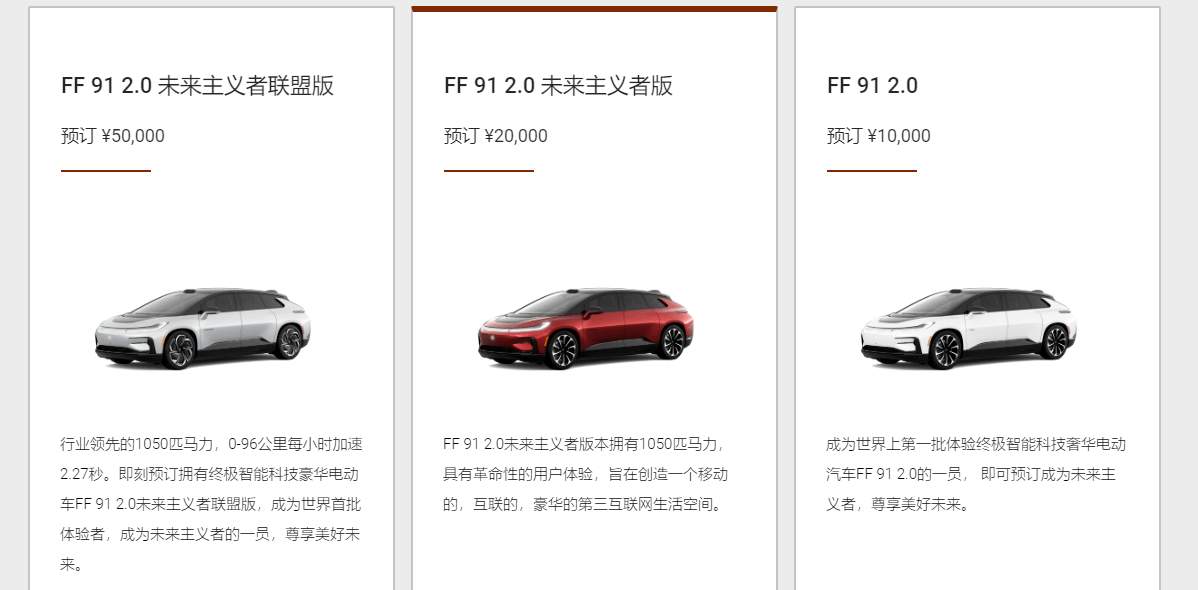 在其他两个版本方面,FF称FF 91 2.0 Futurist的售价同时在FF官网公布。不过搜狐财经未在其官网中找到FF 91 2.0 Futurist和FF 91 2.0版本的售价,仅公布了预订金额。