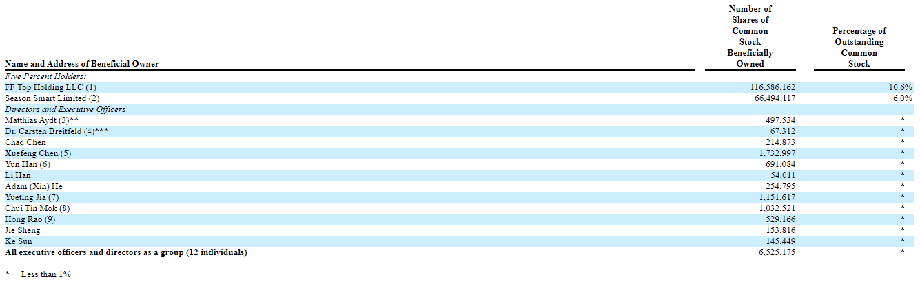 截至2023年4月24日,FF Top Holding LLC为FF的第一大股东,持有1.17亿股,持股比例为10.6%;恒大集团的间接子公司Season Smart Limited为FF第二大股东,持有6649.41万股,持股比例为6.0%。