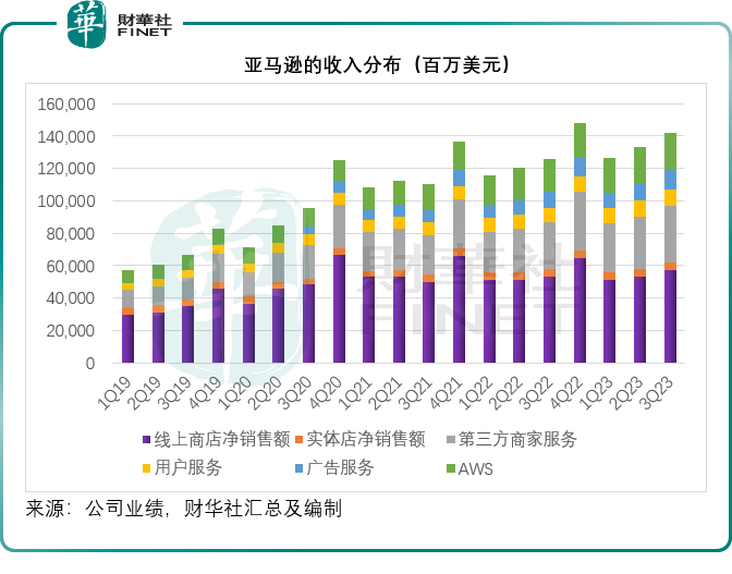 2023年第3季,亚马逊的季度总收入按年增长12.57%,至1430.83亿美元,其中收入贡献最大的线上商店净销售额同比增长7.06%,至572.67亿美元,第三方商家服务收入同比增长19.80%,至343.42亿美元,广告服务更大增26.31%,至120.6亿美元,增幅比依靠广告收入的Meta(META.US)和谷歌还要高,后两家科技公司的9月财季广告营收增幅分别只有23.52%和9.48%。