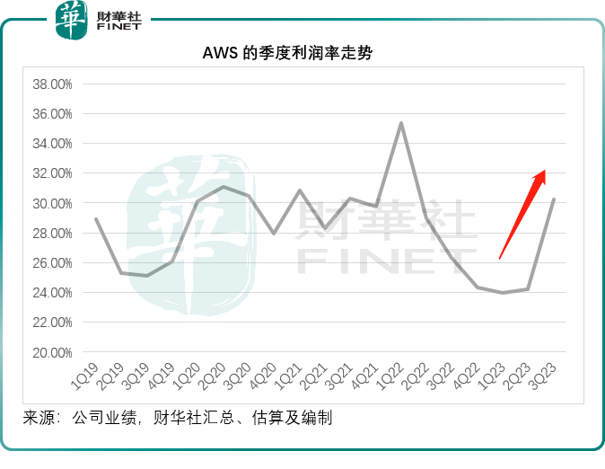 AWS的利润表现却十分理想,2023年第3季AWS分部经营溢利按年增长29.11%,至69.76亿美元,占亚马逊合计经营溢利的62.35%,分部经营利润率则按年提升了近四个百分点,由上年同期的26.31%提高至30.25%,主要因为员工成本下降带来的正面影响。