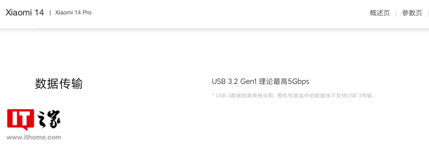 IT之家在昨日的报道中已经详细报道了小米 14 系列机型的参数信息,这里就不再过多赘述。值得一提的是,此次小米 14 系列的 USB-C 接口支持高速的数据传输,小米 14 支持 5Gbps 传输速度(理论传输速度约 500MB/s),小米 14 Pro支持 10Gbps 传输速度(理论传输速度约 1GB/s),这一点在小米 14 系列机型的参数详情页中也可以查询到。