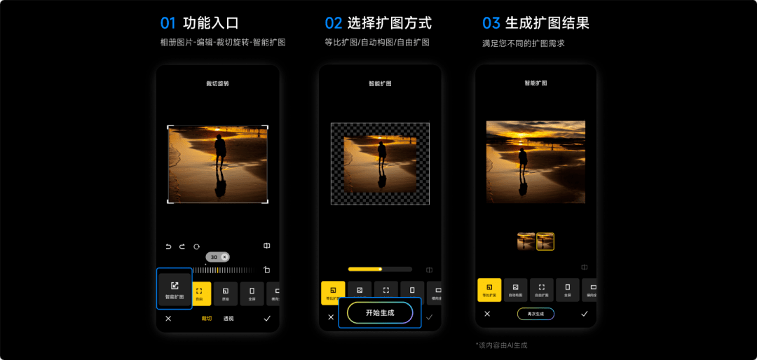 AI 扩图:全新大模型智能扩图,支持等比、自由扩展和自动构图功能。