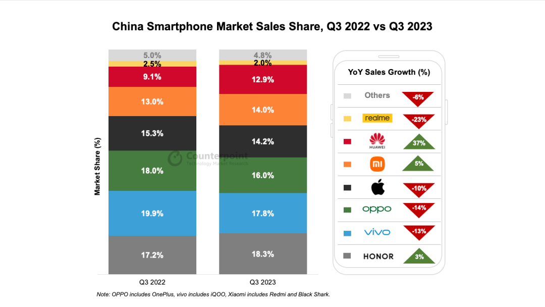 虽然有iPhone 15系列新旗舰加持,但苹果一定程度上受到了华为的冲击,所以销量表现并不太好。Counterpoint数据显示,苹果销量同比下滑10%,以14.2%的份额排名第四。