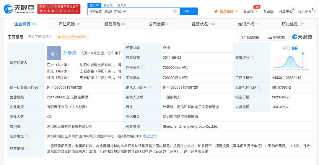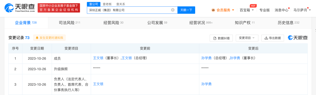 天眼查App显示,近日,深圳正威(集团)有限公司发生工商变更,王文银卸任法定代表人、董事长、总经理,由孙学勇接任。