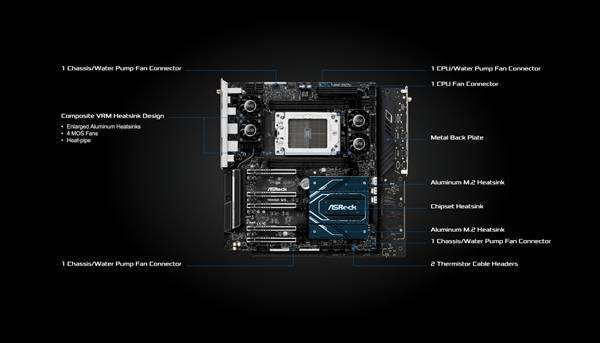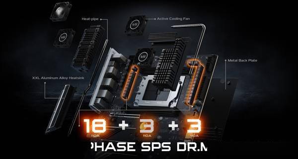 为满足撕裂者700系列强大性能、350W TDP的需要,主板设置了18+3+3相的SPS Dr.MOS供电电路,最大电流110A,搭档黑金电容,覆盖了四个主动风扇、两条热管、超大号铝合金鳍片,芯片组和M.2插槽同样覆盖了大面积散热片。