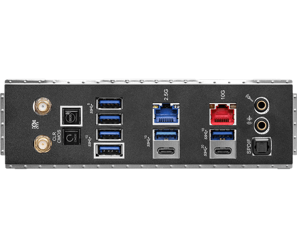 USB接口在背部提供了一个USB-C 3.2 Gen2x2 20Gbps、一个USB-C 3.2 Gen2 10Gbps、四个USB-A 3.2 Gen2 10Gbps、四个USB-A 3.2 Gen1 5Gbps。