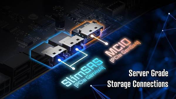 两个M.2 2280 SSD接口(PCIe 5.0 x4和PCIe 4.0 x4),一个SlimSAS SFF-8654硬盘接口(PCIe4.0 x4或者SATA 6Gbps),四个SATA 6Gbps接口,一个MCIO接口(PCIe 5.0 x4)。