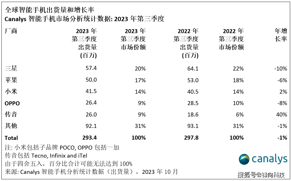 Canalys全球报告显示过去第三季度排名前五的品牌分别是三星、苹果、小米、OPPO、传音,对应的出货量分别为:5740万台、5000万台、4150万台、2640万台、2600万台。其中苹果、三星、OPPO同比都是下降的,小米与传音同比是上涨的。