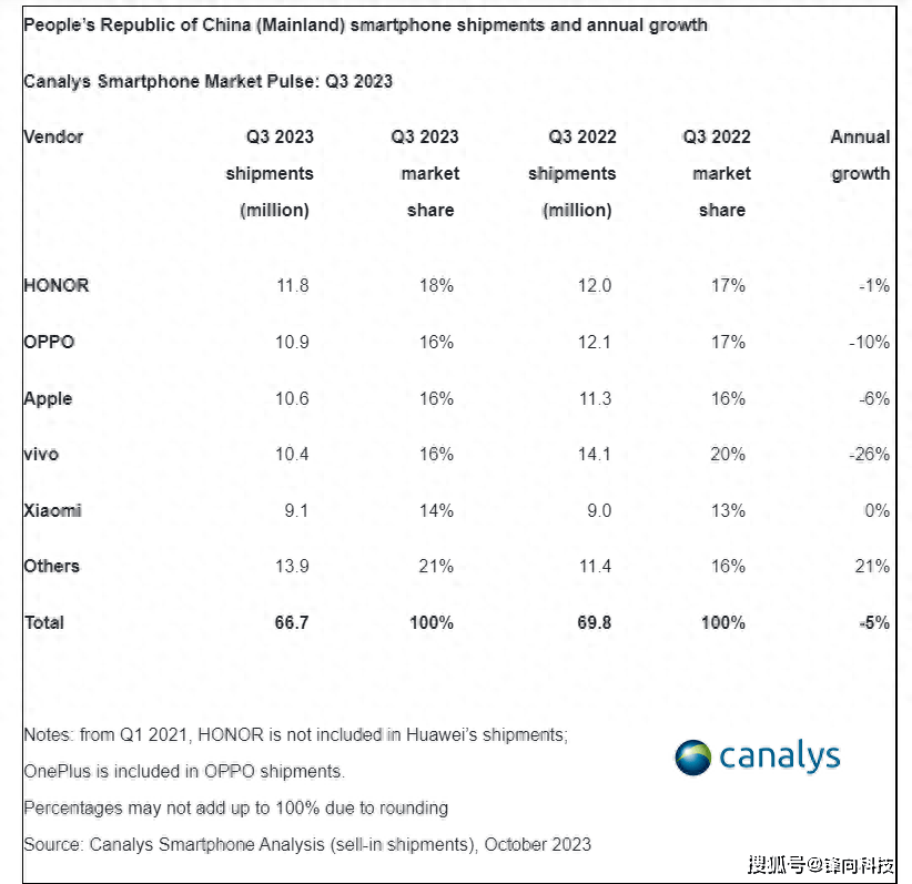 Canalys国内Q3报告显示,排名前五的品牌分别是荣耀、OPPO、苹果、vivo、小米,对应的出货量为1180万台、1090万台、1060万台、1040万台,910万台。其中荣耀、OPPO、苹果、vivo同比都是下滑的,只有小米同比是持平的状态。