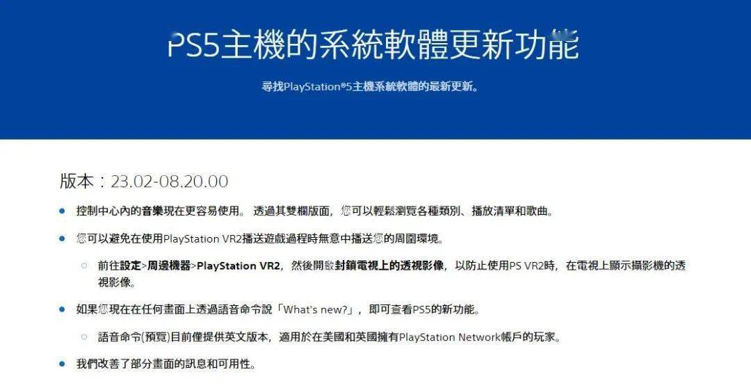 索尼发布了PS5主机23.02-08.20.00版本的系统更新,大小约为1.185GB,具体包括对PlayStation VR2的更新,以及改善了部分画面讯息。