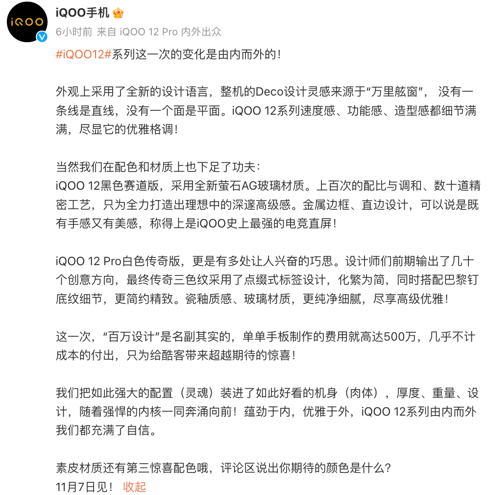 目前,iQOO手机官方已经正式宣布,iQOO 12系列将于11月7日正式发布。随着新品发布时间的接近,iQOO手机官方也开始了新机剧透预热。