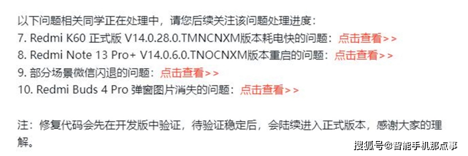 同时红米K60正式版V14.0.28.0.TMNCNXM版本耗电快的问题、红米Note13 Pro+ V14.0.6.0.TNOCNXM版本重启的问题均正在进一步处理中。