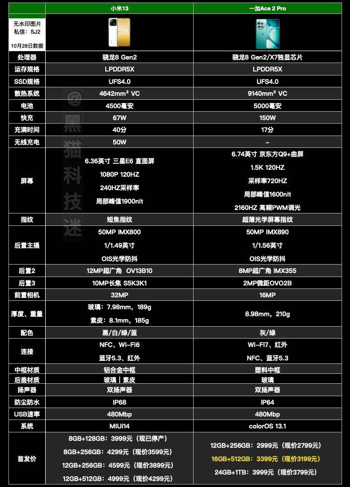 1,一加Ace 2 Pro是塑料中框+玻璃材质,而小米13是铝合金中框+玻璃/素皮材质,对质感的要求更高。