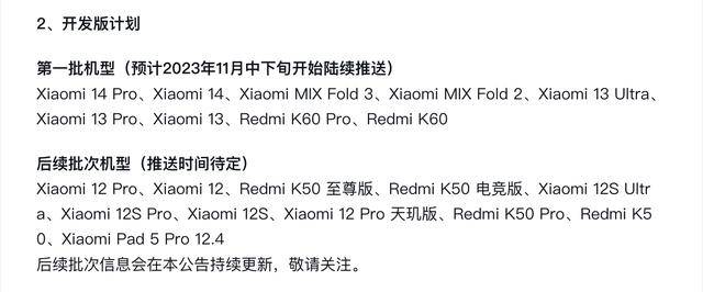 除了正式版以外,开发者版本将于11月中下旬开始陆续推送,考虑到会有一定的BUG,不推荐普通用户尝鲜。第一批机型仅有10款,分别为小米12系列(2款),小米13系列(3款)、小米MIX Fold2、小米MIX Fold3,红米K60和红米K60 Pro。