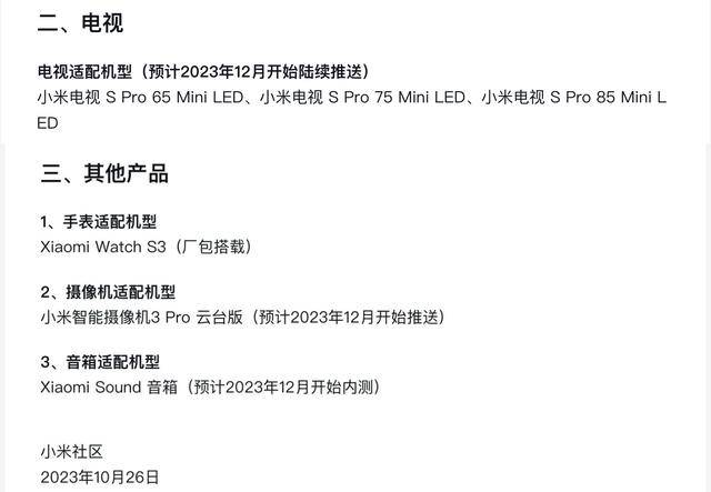 三款平板电脑为小米平板6系列(3款),三款电视均为小米电视S Pro Mini LED系列包括65英寸,75英寸和85英寸三个型号。小米Watch S3出厂搭载澎湃OS,小米智能摄像机3 Pro云台版预计12月份开始推送,小米Sound音箱预计12月份开始内测。