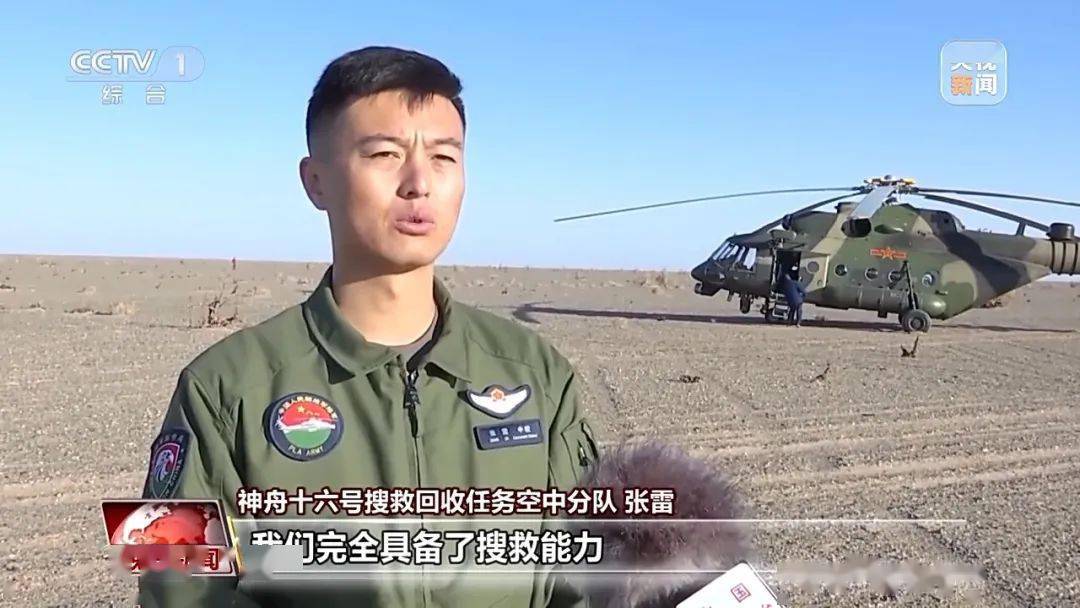 神舟十六号搜救回收任务空中分队 张雷:通过今天的训练,我们完全具备了搜救能力,能够精准高效、安全稳妥地完成好此次任务。确保舱落机降人到,为航天员保驾护航。