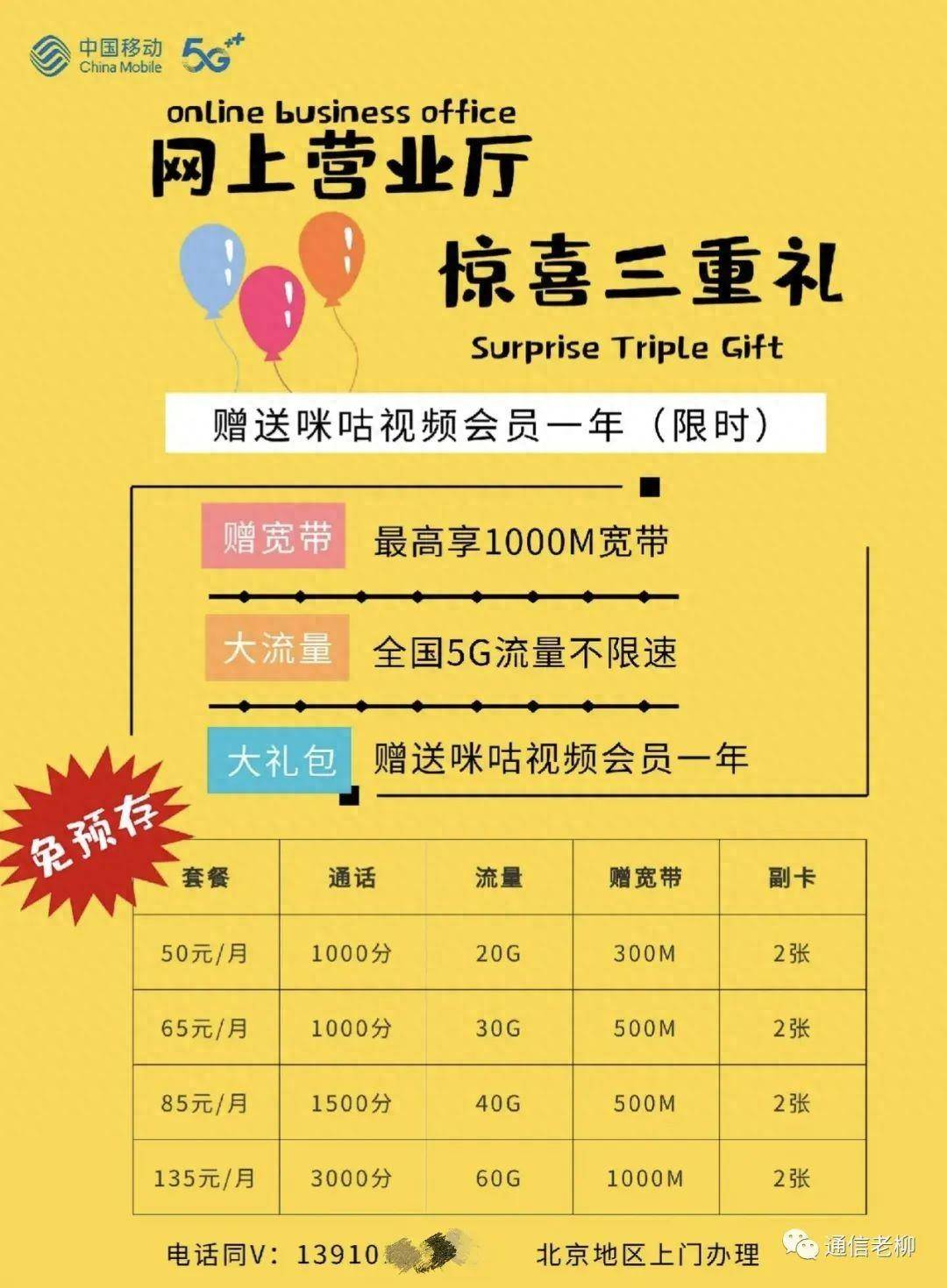 从网友那里了解到,中国移动在北京推出了非常划算的资费套餐,最低的只要50元就可以使用300M宽带+1000分钟通话+20G流量,这个价格乍一看和别的地方的资费比并无太多优势,但关键是还可以得到一年的咪咕视频会员服务,看足球篮球等各种体育节目直播和各种电影电视剧是够了,相当于提升了宽带和流量的使用价值,对有视频需求的人来说还是很有吸引力的,移动这个套路有点意思。