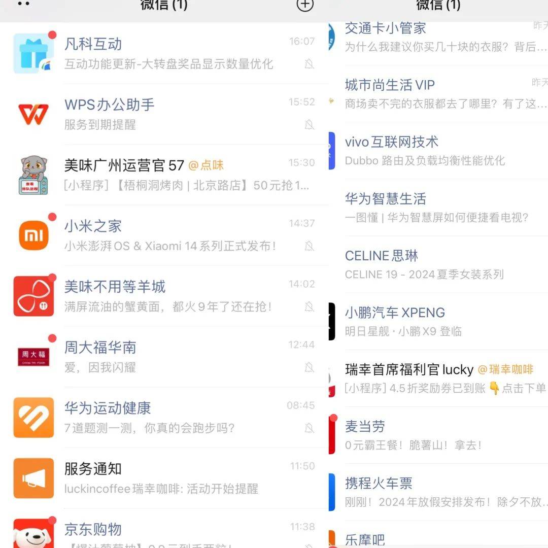 那我手机上微信首页列表,基本上都是各种的商家公众号了。