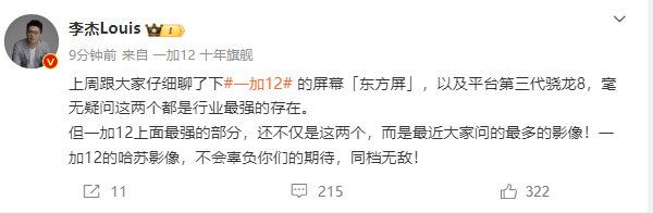 【手机中国新闻】一加中国区总裁李杰持续发文为一加12进行预热。10月30日,手机中国注意到,李杰发文称:上周跟大家仔细聊了下一加12的屏幕“东方屏”,以及移动平台第三代骁龙8,毫无疑问这两个都是行业最强的存在。李杰表示,一加12最强的部分不仅是这两个,而是影像,一加12的哈苏影像,不会辜负你们的期待,同档无敌!