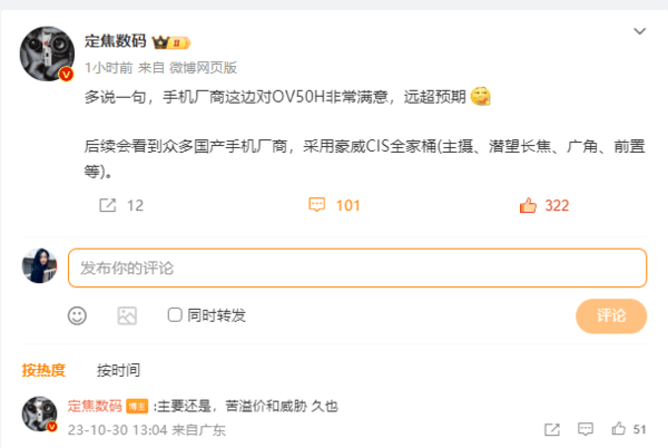 【手机中国新闻】手机摄影技术的发展,一直被视作是各个手机品牌之间的一场内卷竞争。特别是在主摄传感器领域,不同品牌通过引进不同的传感器来提升手机的拍摄能力。而近几年,索尼的传感器几乎成为了手机旗舰机的主流选择。然而,豪威科技作为一家国内传感器供应商也开始崭露头角。10月30日,手机中国注意到,有数码博主爆料称,手机厂商对豪威的OV50H传感器非常满意,远超预期,后续将会看到众多国产手机厂商,采用豪威CIS全家桶,包括主摄、潜望长焦、广角、前置等。