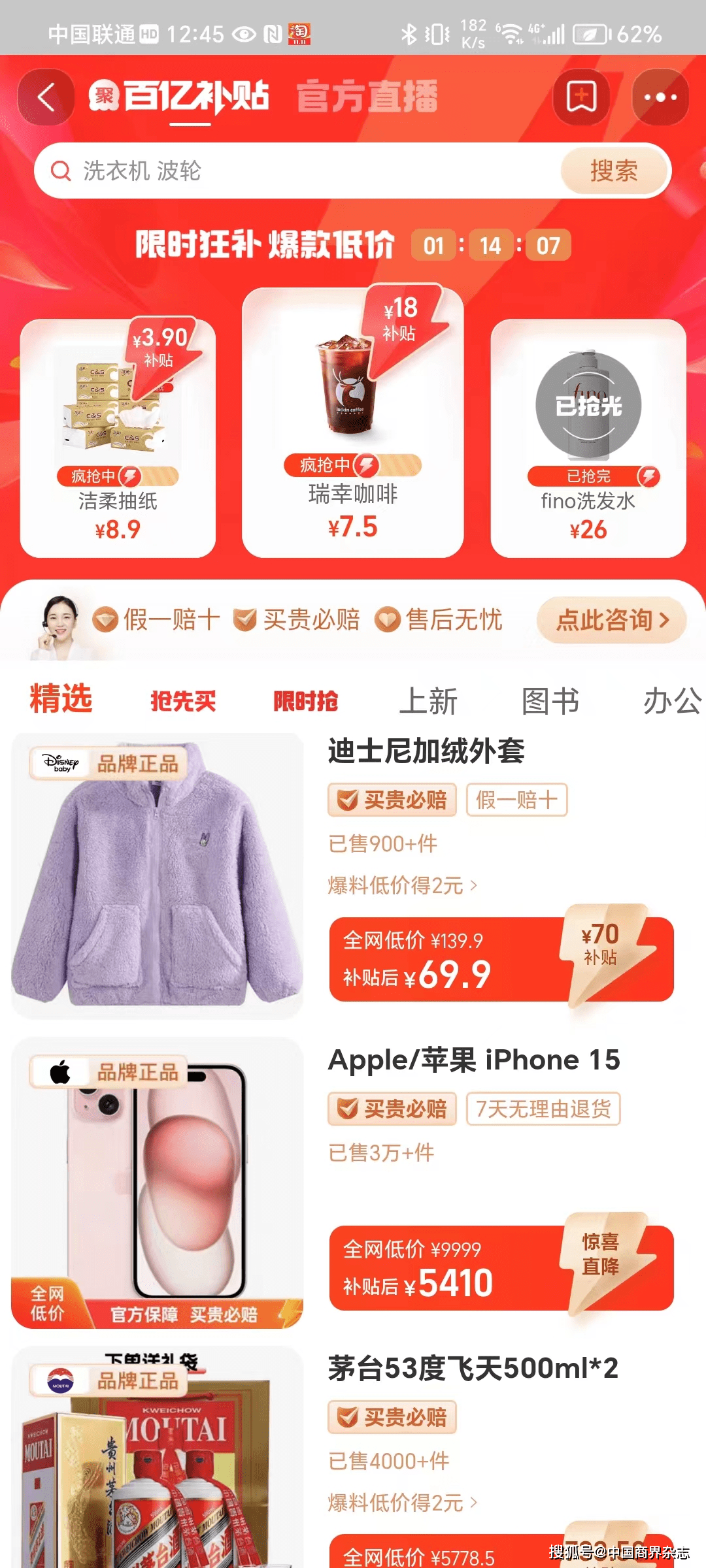 近日,中国商报记者对比了淘天、京东、拼多多、抖音4家电商平台的百亿补贴和超值购等栏目发现,淘天的百亿补贴品类分别是iphone15、53度飞天茅台、心相印卷纸、海尔洗衣机、雪中飞羽绒服等,京东百亿补贴产品有红豆居家睡衣、西门子洗衣机、361度跑鞋、太粮茉莉米等,拼多多百亿补贴推的有iphone 15 Pro、小天鹅洗衣机、华帝油烟机、水星家纺类产品等。