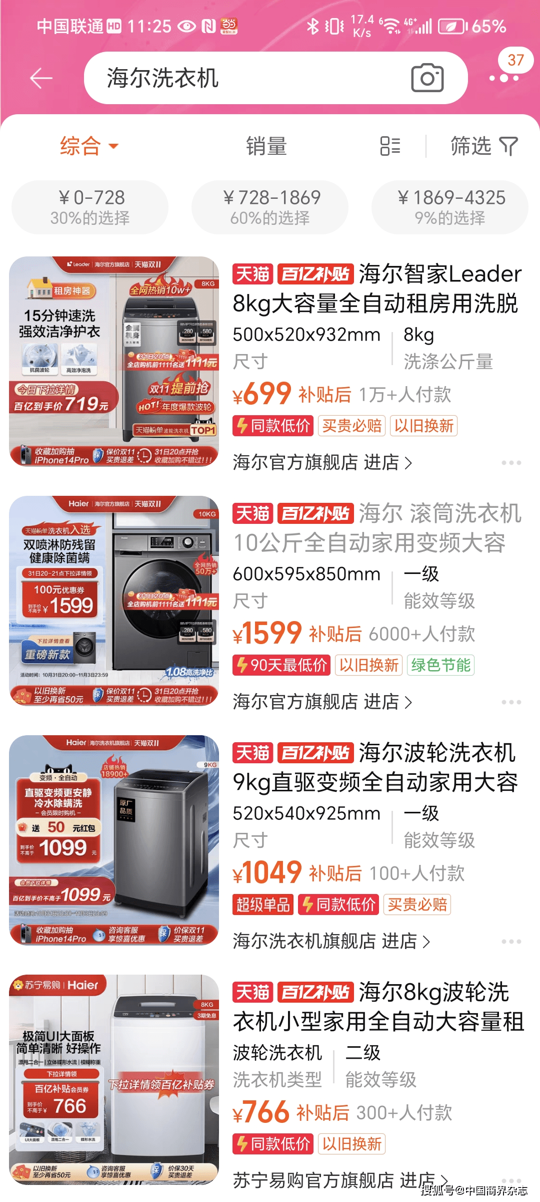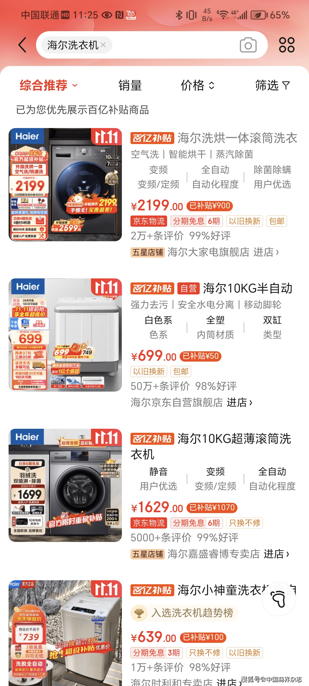 从这些产品中记者随机抽取了10件商品在各个平台的百亿补贴栏目进行搜索发现,每家平台的商品大部分没有同品,即使有部分同类产品,包装大小或者型号也不一样。比如海尔洗衣机,每家平台百亿补贴主推的产品型号都不一样,有的平台推海尔大神童洗衣机,有的则推的是海尔小神童洗衣机。