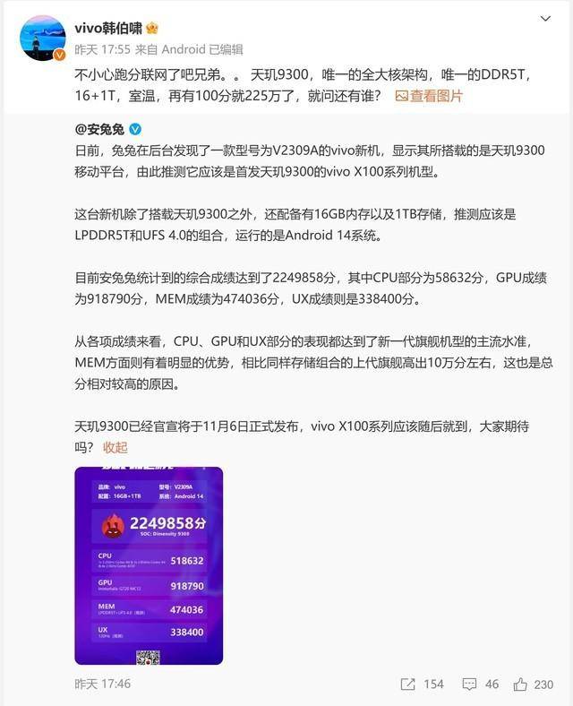 vivo产品经理韩伯啸也在微博中回应了有关跑分的内容,这次vivo X100超高的跑分成绩,主要得益于全大核架构的全新天玑9300旗舰平台、LPDDR5T内存以及UFS4.0存储所组成的性能铁三角组合。