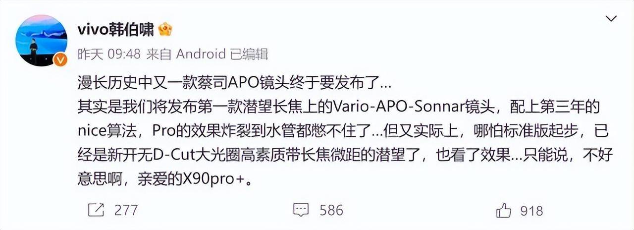 在此之前,已有消息透露vivo X100系列将全系配备潜望长焦,并支持长焦微距。更令人惊喜的是,它还将搭载手机行业中唯一获得蔡司APO标准认证的浮动长焦摄像头。