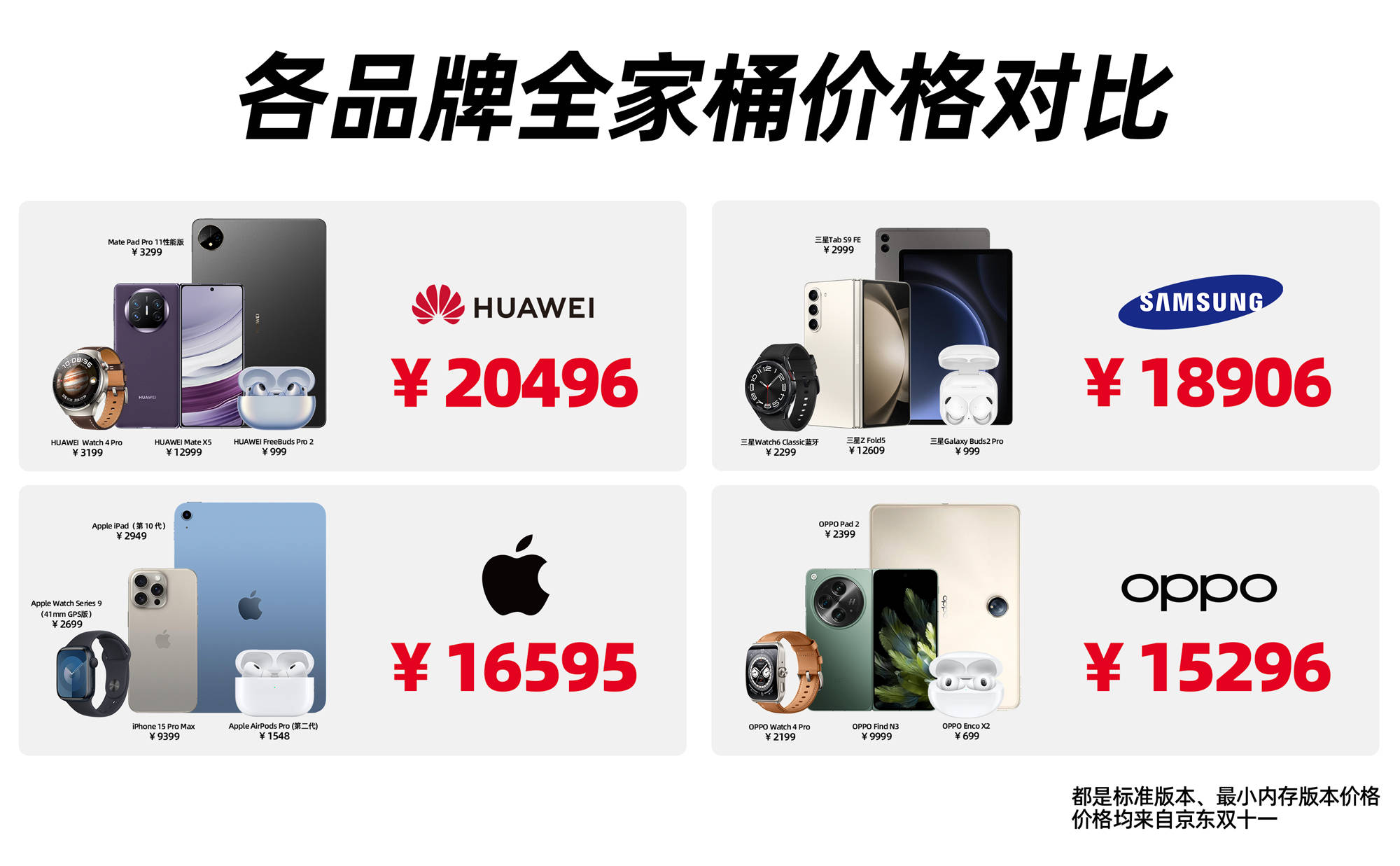 想不到目前各大品牌全家桶产品中,最贵的居然不是苹果?不得不说,想要凑齐一套全家桶的话,需花费的资金还真不少,相对来说,OPPO全家桶是性价比最高的了,折叠屏+平板+手表+耳机一整套产品的到手价是1.5w出头,相较其他几家品牌来说便宜不少。